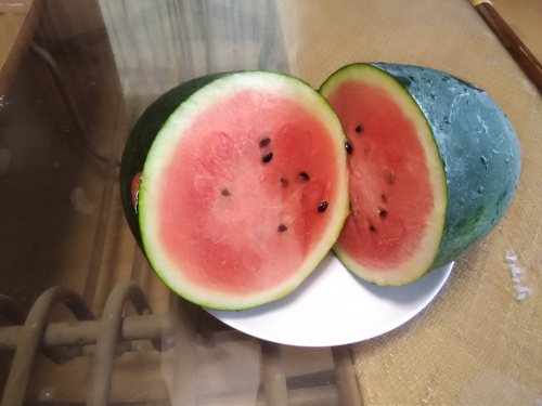 割れなきゃ食べられないでしょ!とおもいますが、案外包丁の通りはよくなかは真っ赤にきれいに出来上がっています。